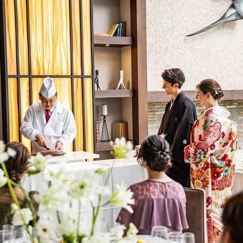 歩みに合わせてガラスのバージンロードに光が灯っていく様が幻想的。
